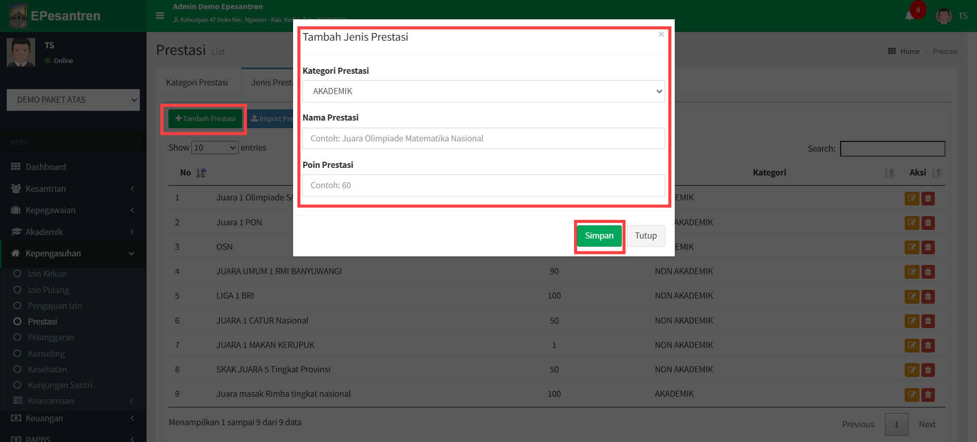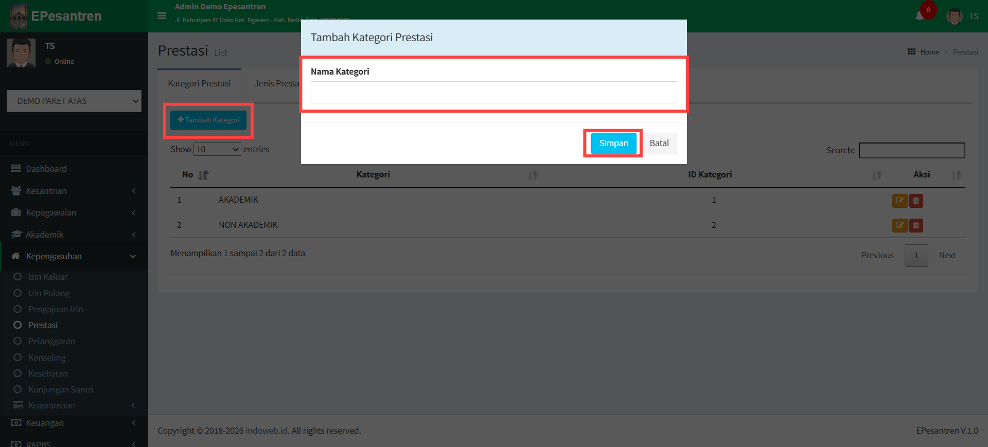3. Silahkan isi Kategori Prestasi dengan cara Klik Tambah Kategori -> Masukkan Nama Kategori Prestasi -> Klik Simpan
