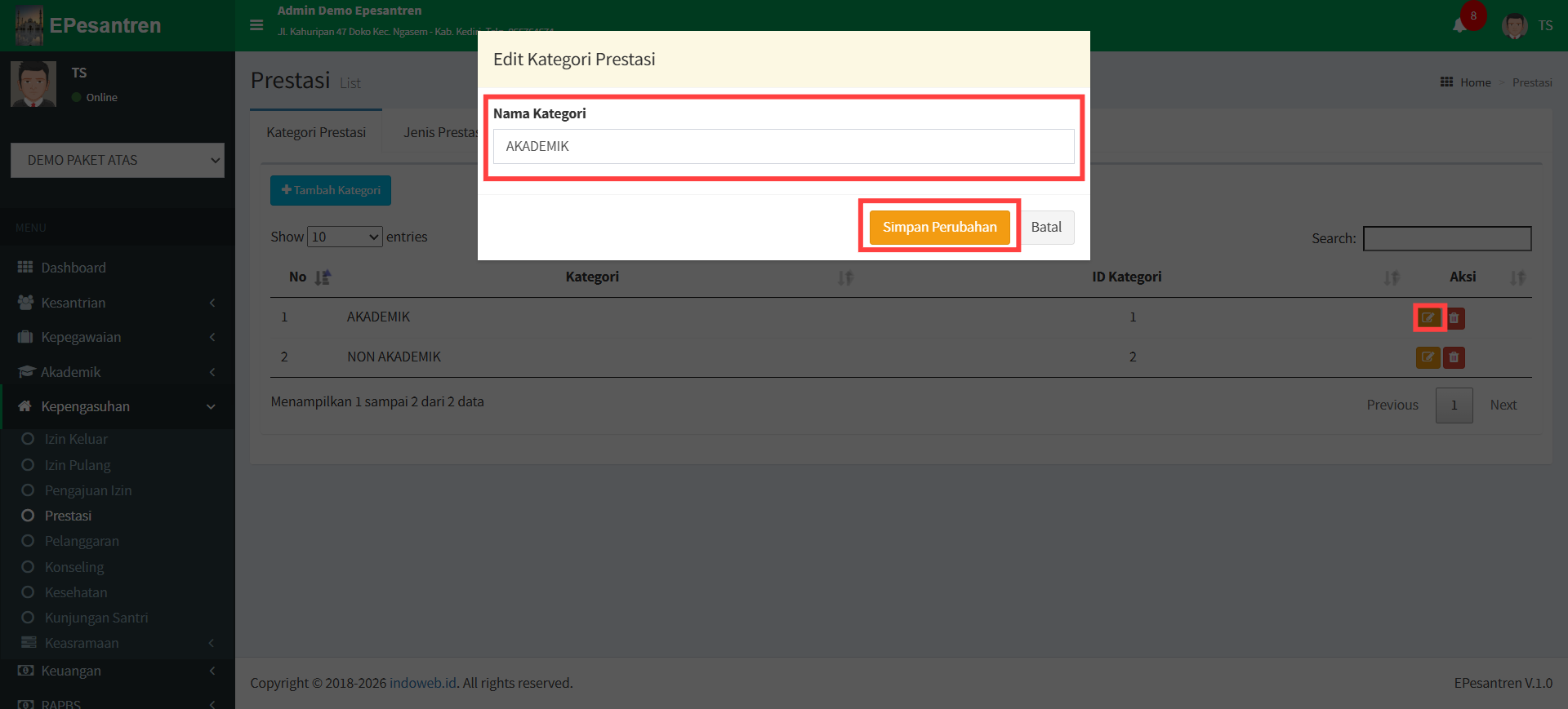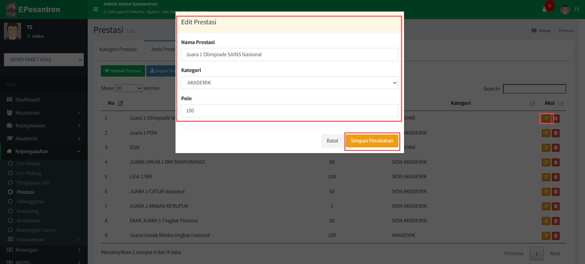 7. Edit Prestasi Klik Tombol Edit -> Ubah Nama prestasi dan Poin -> Ubah / Tidak Mengubah Kategori -> Klik Simpan.