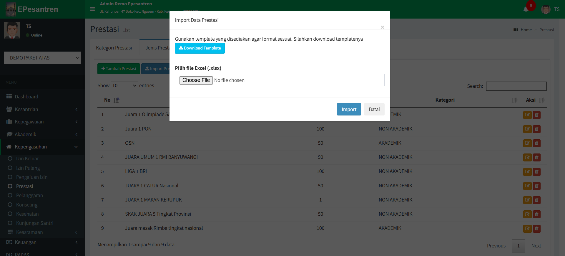 8. Import Data Prestasi yaitu dengan cara Klik Tombol Import Prestasi -> Muncul Pop Up Import Data Prestasi -> Download Template -> Isikan semua prestasi di template yang sudah di download -> Upload template yang sudah di isi.