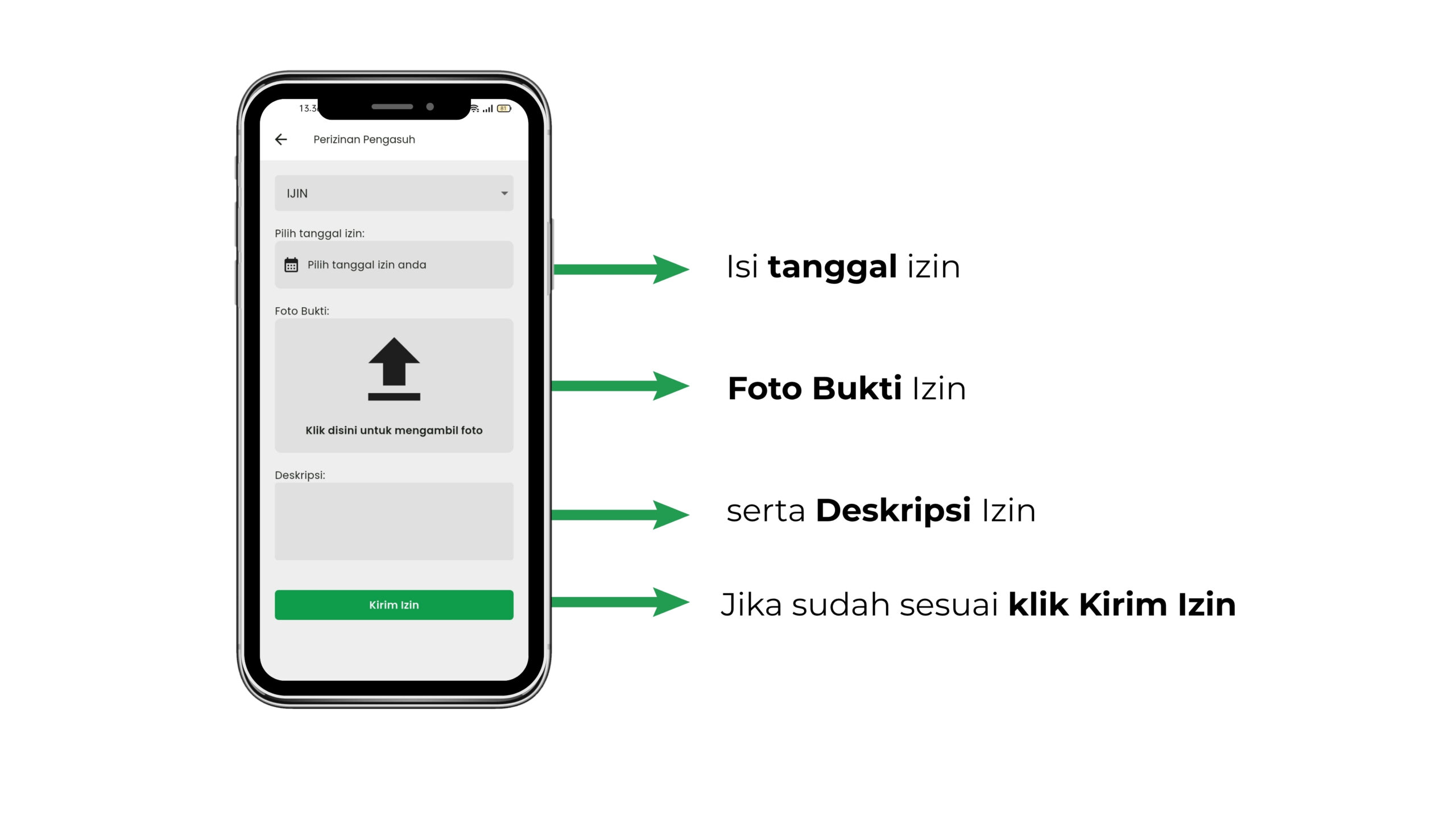 - Isi tanggal izin, Foto Bukti Izin, serta Deskripsi Izin