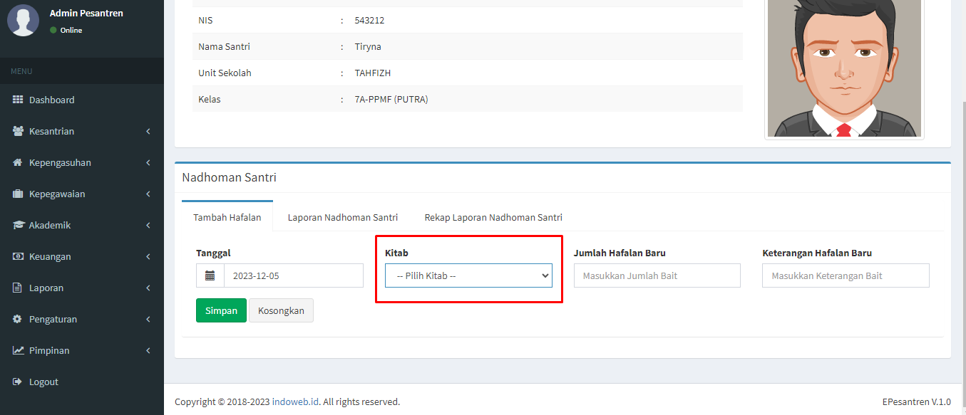 Pada menu Kepengasuhan ada menu nadhoman, nadhoman adalah hafalan seperti hafalan Al-Qur’an. Nadhoman ini adalah hafalan untuk kitab yang sudah di masukkan di menu kitab. Berikut tutorial “Cara Tambah Hafalan / Tahfidz”:
