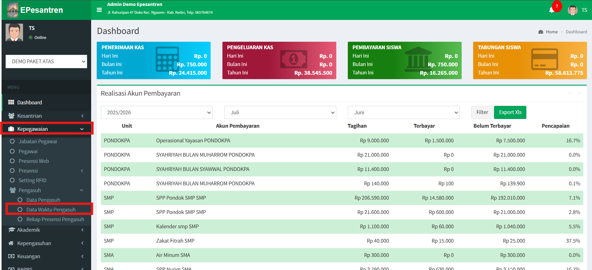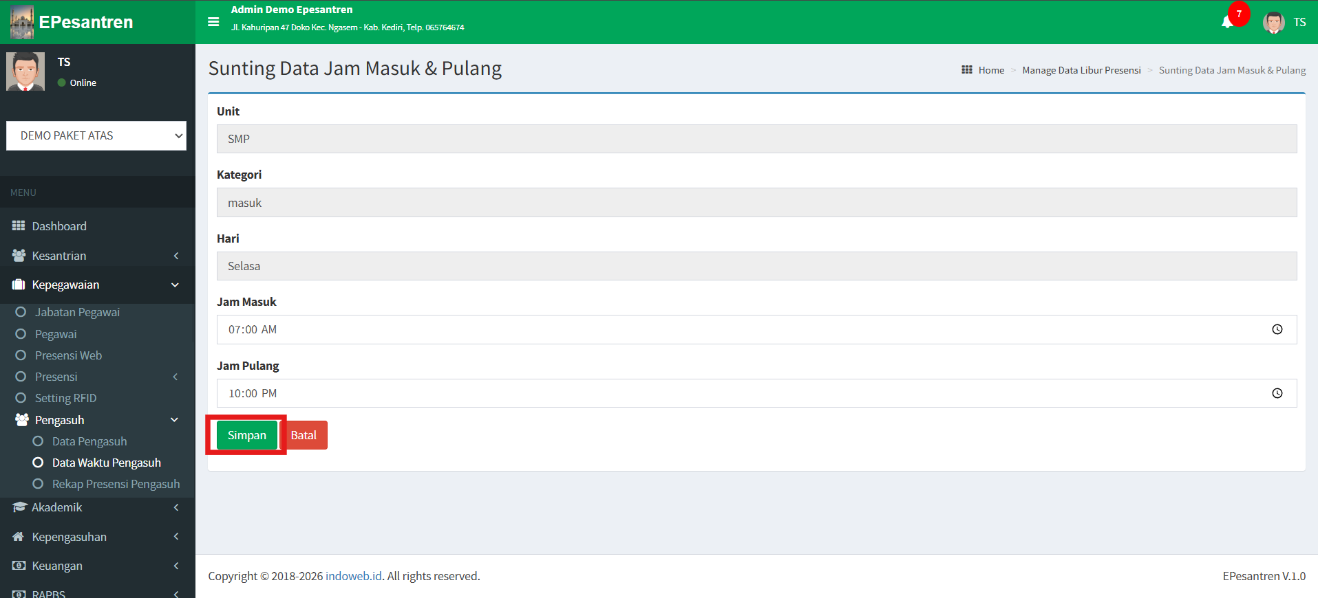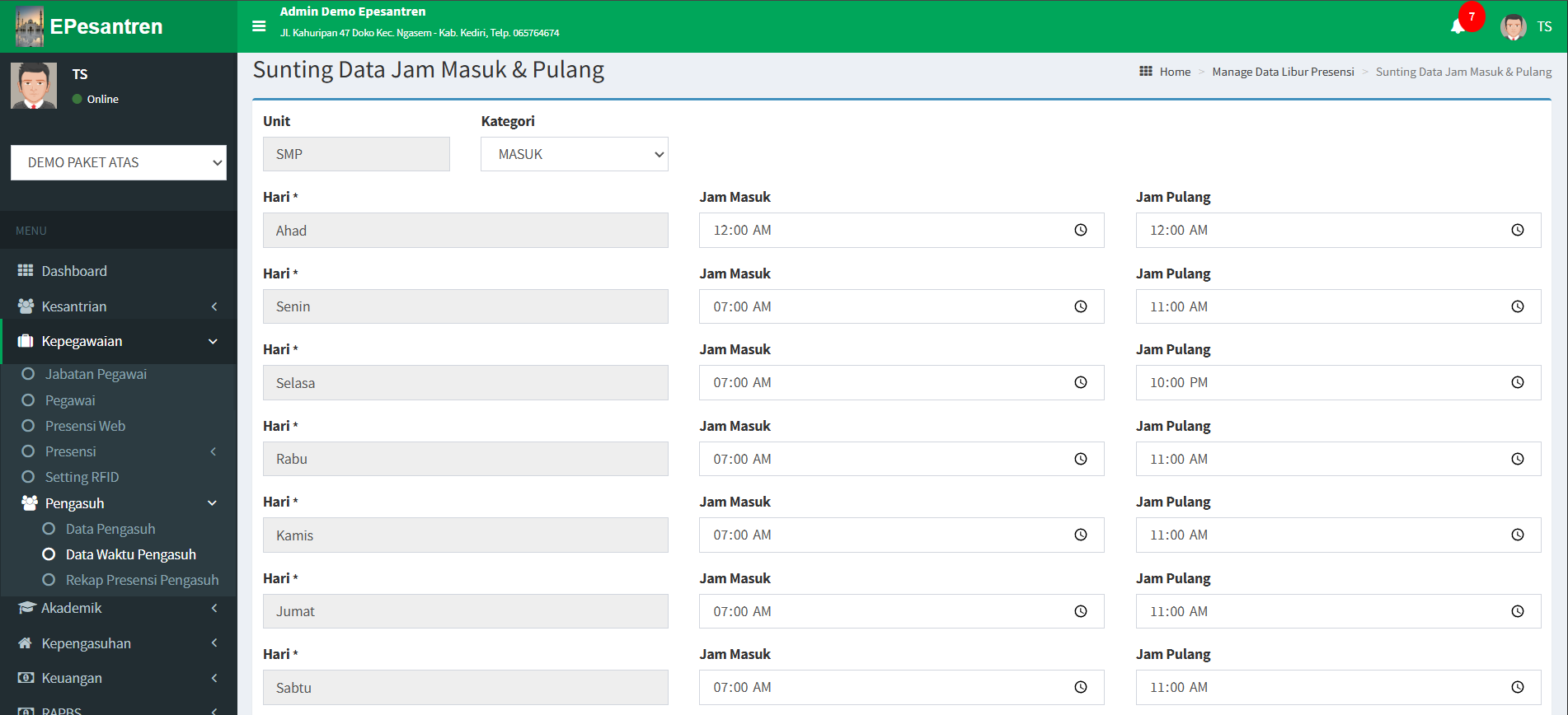 Pada menu Kepegawaian sudah ada menu Pengasuh. Pada tutorial ini akan saya jelaskan Tutorial untuk mengatur data waktu presensi pegawai yang bertugas sebagai Pengasuh.