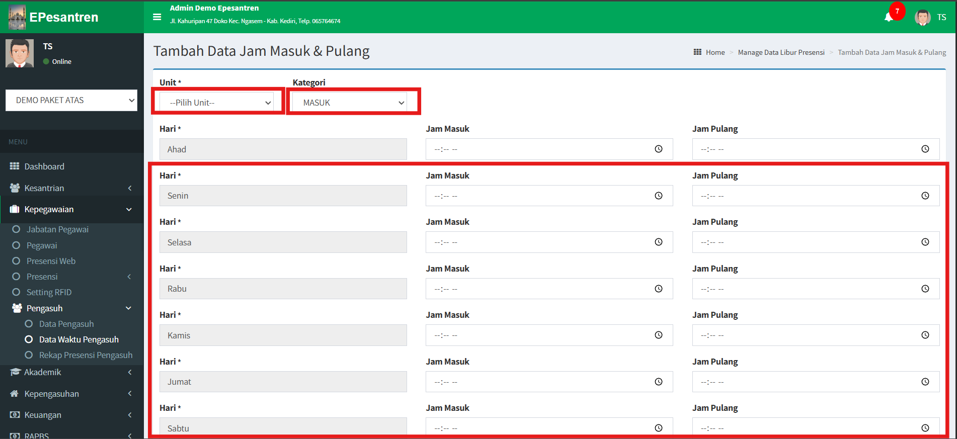 - Setelah klik tambah anda akan di arahkan ke halaman Tambah Data Jam. Pilih Unit -> Pilih Kategori Masuk atau Istirahat -> Setting jam sesuai hari -> Klik Simpan