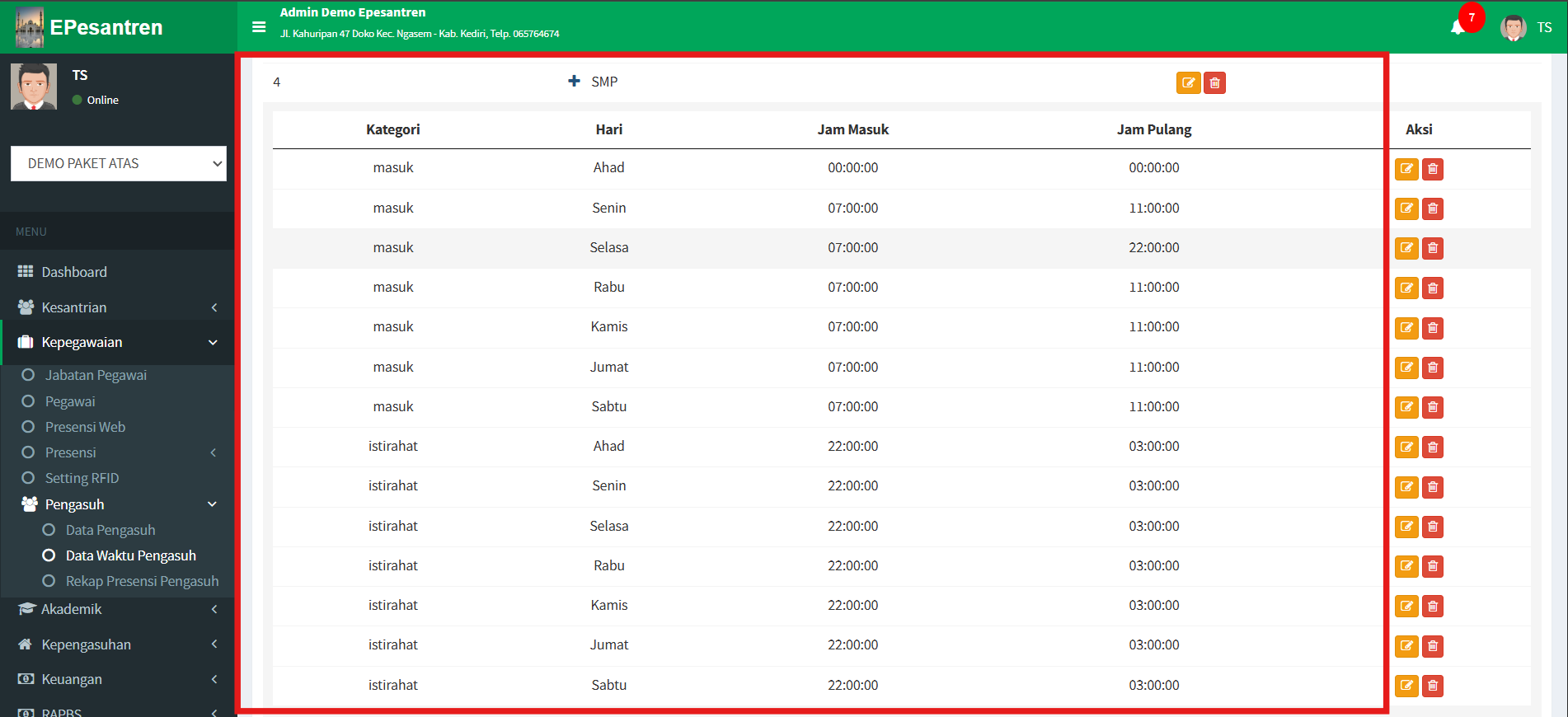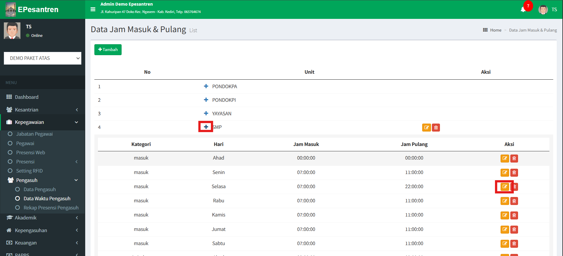 - Apabila ingin mengubah data jam pada hari tertentu. Klik [+] pada unit dan Klik Tombol Kuning (Edit) di hari yang ingin di ubah.